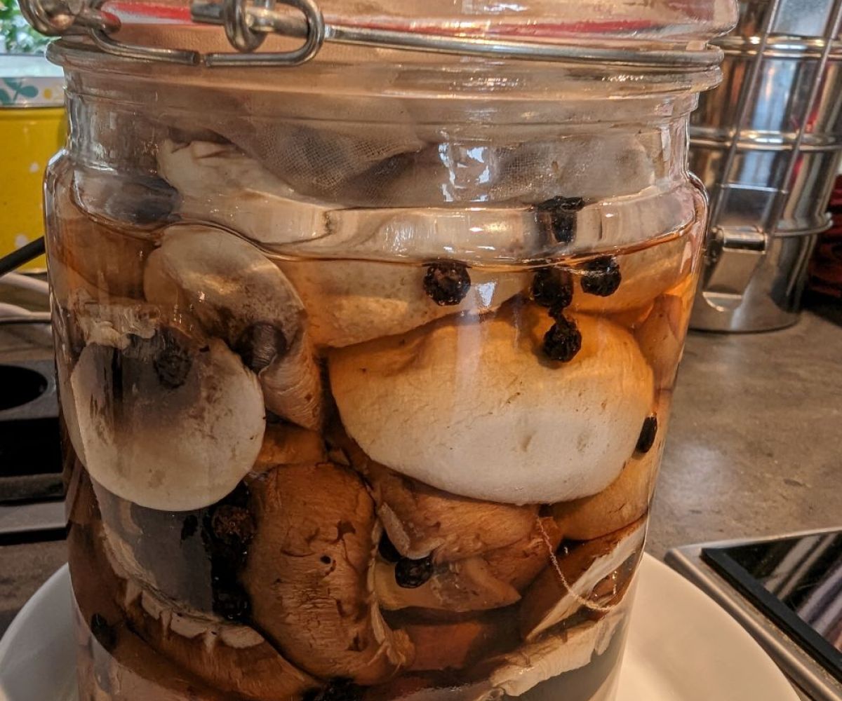 Da es gerade in meiner Küche wieder stark brodelt, legte ich auch die Champignons in Salzlake (2%ige Lösung) ein und fermentierte das ganze für 3 Tage.